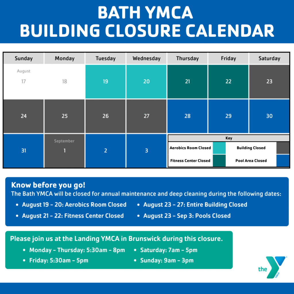 The Bath YMCA will be closed in late August for a period of annual maintenance and deep cleaning. Here is a breakdown of our planned closures: