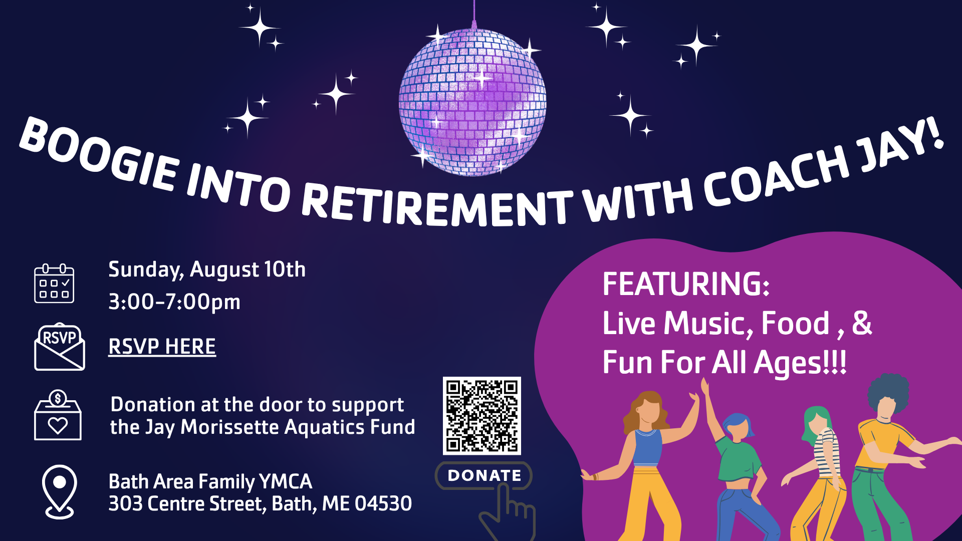Please join us on Sunday, August 10 from 3 – 7pm at the Bath YMCA to celebrate coach Jay’s retirement. There will be food, live music, and dancing! Donations will be accepted at the door to a new aquatics fund in Jay’s name.